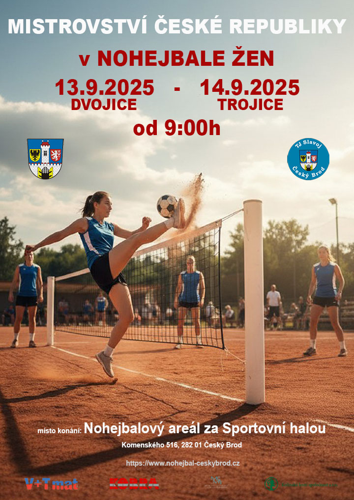 Nohejbalový oddíl TJ Slavoj Český Brod pořádá 33. Mistrovství republiky žen v nohejbale dvojic v sobotu 13.9. a trojic v neděli.13.9.2025. Na nohejbalových kurtech za Sportovní halou bude k vidění celorepublikový výběr zejména z první ligy. Naše nohejbalistky pravidelně bojují o medaile a stojí na stupních vítězů na MČR, tak je přijďte podpořit do nohejbalového areálu za sportovní halou, Komenského 516, Český Brod.